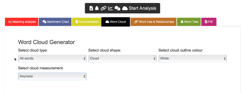 The next screenshot illustrates the options you will be offered to create your own bespoke word cloud based on the text / data you wish to analyse: